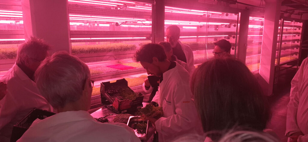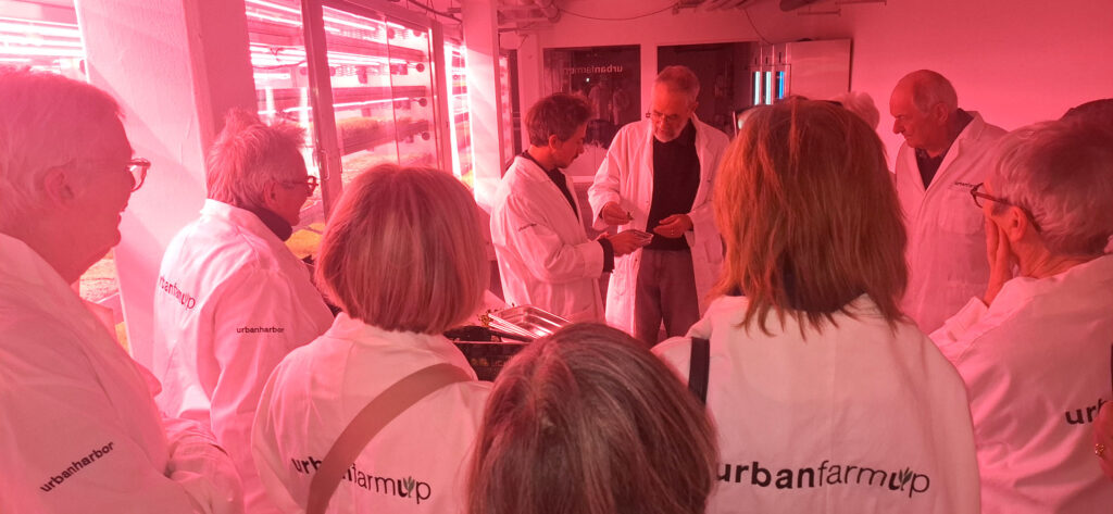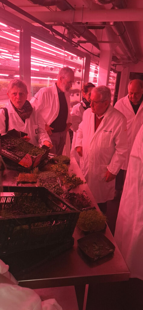Neben ihrem gesundheitlichen Wert überzeugen Microgreens auch kulinarisch: Mit intensiven Aromen und vielfältigen Geschmacksrichtungen – von mild bis scharf – finden sie vor allem in der gehobenen Gastronomie Verwendung. Wir erhielten vor Ort Einblicke in die Produktion sowie in die Einsatzmöglichkeiten der Pflanzen in der Küche. „Wir durften die Keimlinge vor Ort auch probieren“, so unsere zweite Vorsitzende Elfriede Krüger. „Sie sind ungefähr so groß wie Kresse. Man kann nicht immer direkt ersehen, welches Gemüse man in junger Form vor sich hat. Am Geschmack erkennt man es dann aber doch schnell und das Geschmackserlebnis ist wirklich interessant. Wir haben Erbse, Brokkoli, Radieschen, Knoblauch und Weiteres probiert.“. „Und die Produktion erfolgt flächenarm. Für die 200 m², die urbanfarmup an unterirdischer Anbaufläche benötigt, bräuchte man mit konventioneller Landwirtschaft 31.000 m²“, so ihr Mann Ulrich Krüger gemerkt. Der Besuch verdeutlicht, wie eng Themen wie Nachhaltigkeit, Ernährung und Stadtentwicklung heute miteinander verknüpft sind. Projekte wie urbanfarmup zeigen, wie innovative Technologien dazu beitragen können, Städte resilienter und umweltfreundlicher zu gestalten.